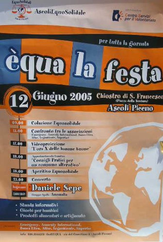 La festa è nata in conseguenza del fatto che lequosolidale è conosciuto oggi, ma non abbastanza, quindi per far conoscere di più questo discorso, che è nato una trentina di anni fa e si è diffuso soprattutto grazie al passaparola, perché lequosolidale si regge sul volontariato, quindi non ci sono soldi per fare pubblicità. Quindi per far conoscere di più e apprezzare questo sistema, che porta dei grossi vantaggi alle popolazioni del Terzo Mondo. Lidea della festa è nata così.