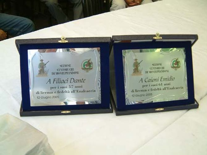 Al termine dei due interventi la dinamica sezione di Centobuchi, ha voluto premiare con una targa Emidio Caioni per i suoi 61 anni di licenza e fedeltà allEnalcaccia. Altrettanto ha fatto con Dante Filiaci per i suoi 57 anni.
