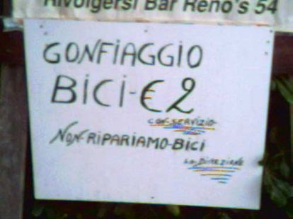 Sono sambenedettese e come spesso mi succede faccio delle camminate sul lungomare. Ieri sera con degli amici ci siamo imbattuti in un cartello posto davanti ad un noleggio di bici e risciò che tra l' altro recitava: GONFIAGGIO BICI 2 CON SERVIZIO !!. LA DIREZIONE. Chissa, che cosa si intende per servizio. Forse sarà un extracomunitario ad effettuare il gonfiaggio usando i polmoni così risparmiamo la pompa e abbiamo on occupato in nero in piu !!!! Mi vergogno per la direzione e mi scuso a suo nome con coloro che ( spero pochi) cadranno nelle sue grinfie.