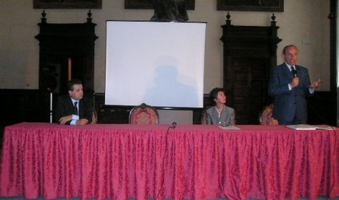 La dottoressa Benedetta Montevecchi, della soprintendenza al patrimonio storico-artistico, il prof. Stefano Papetti, direttore della Pinacoteca e Angelo Pavoni, restauratore dellopera insieme a Rosella Marini, hanno presentato oggi presso la Sala della Vittoria il restauro del dipinto Le stimmate di San Francesco.