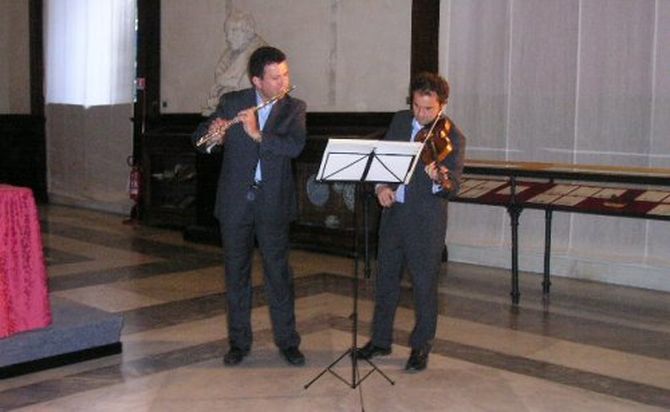 Prima dellintervento del prof. Pavoni, un piacevole intermezzo musicale, ad opera di Corradetti al flauto e Fabiani al violino, ha spezzato il ritmo della conferenza. I due musicisti hanno eseguito Quattro invenzioni a due voci di Bach e la Sonata in re minore di Locatelli.