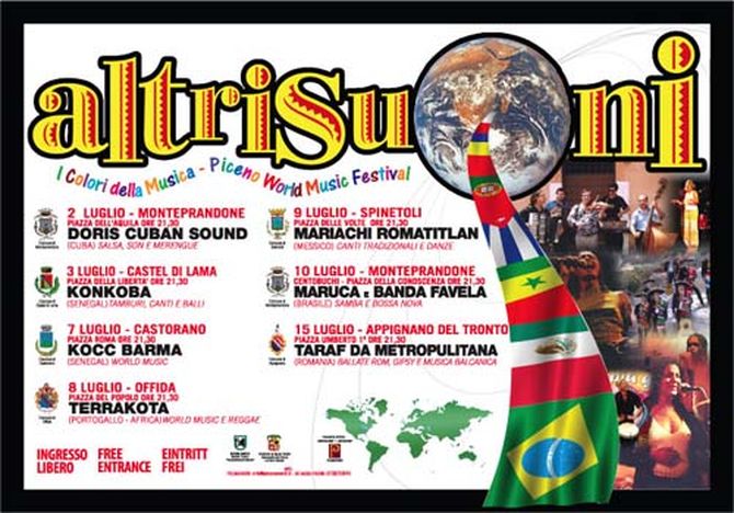 La rassegna aprirà i battenti presso la piazza dell'aquila di Monteprandone il 2 luglio alle ore 21 e 30, grazie al gruppo Doris Cuban Band, che porterà con sé tutto un repertorio costituito da salsa, son e merengue. Il giorno dopo, in Piazza della Libertà a Castel di Lama arriverà il carico multietnico dei Konkoba, formazione che proviene dal Senegal e che riesce a trasferire oltrepatria gli usi e i costumi del mondo da cui proviene mediante uno spettacolo di forte impatto scenico.