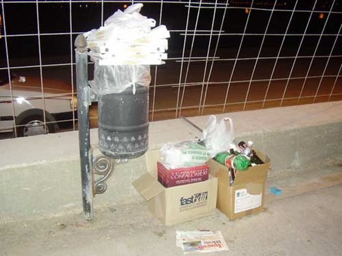Lo abbiamo detto e lo ripetiamo. Ci sono molte altre aree cittadine con seri problemi da risolvere. Ma questo è un posto centrale. Una meta preferita da cittadini e turisti. Un biglietto da visita della città. Come la rotatoria in Viale dello Sport. Come il Lungomare Sud. Qui non si tratta di fare grandi e complicati progetti di ingegneria urbana o di architettura stradale. Non si tratta di investire ingenti somme. Non occorrono tempi lunghi o pratiche burocratiche. Occorre solo passare un po più spesso a vuotare i cestini ! O aggiungerne altri provvisori aspettando lintera riqualificazione del posto. Erano pieni e odoravano alle ore 23. Non osiamo immaginare il profumo alle ore 14 di una giornata con il sole a 35°.