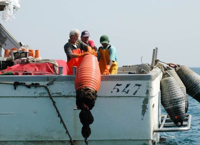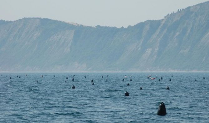 Filari di mitili. Era la meta dellescursione marittima organizzata, con partenza dallantico porticciolo di Gabicce Vallugola, nello splendido scenario del parco del San Bartolo, ad un impianto di mitilicoltura, uno dei più grandi della regione.