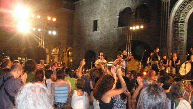 E allora passando per Paisà, Tuttegual songe creature, Into viento, Salvammo munno, Puort Aller, Canta Palestina, Chestè lAfrica, gli spettatori in piazza del Popolo sono stati rapiti dallenergia trascinante di Avitabile e dalle musiche sprigionate dagli strumenti tradizionali napoletani, insieme alle botti, ai tini e alle falci usati come percussioni.