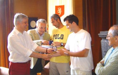 un momento della visita in comune del presidente della F.I.T. Ricci Bitti e dei due finalisti del torneo Sanguinetti e Bracciali.