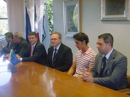 E’ davvero indovinato il soprannome di “Filippo Magno” per il campione pesarese, detentore del titolo mondiale nella disciplina regina del Nuoto: i 100m stile libero. Grande campione dello sport mondiale, Filippo Magnini, ma anche grande simpatia e forte personalità. Così infatti è apparso ai tanti giornalisti e non, presenti alla conferenza stampa in Regione, dove Magnini è arrivato questa mattina, accompagnato dai genitori Silvia e Gabriele. Una visita ufficiale, dunque,  a Palazzo Raffaello,  per ricevere un’altra medaglia d’oro,  appositamente coniata per lui, che il presidente della Regione, Gian Mario Spacca gli ha consegnato a nome della comunità marchigiana, in segno di riconoscenza per la magnifica impresa compiuta.
