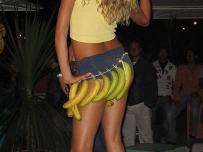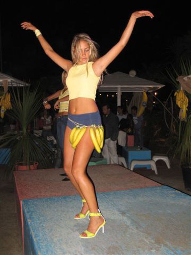 E allora banane, ananas…tutto nel segno del colore giallo, come la musica caraibica o le animatrici sul cubo che hanno indossato sexy gonnellini fatti proprio con le banane, ispirazione da un mito del passato: niente meno che Josephine Baker, la Venere nera, che cantava e ballava avvolta in nuvole di piume e di perle, quando non indossava il suo gonnellino di banane.