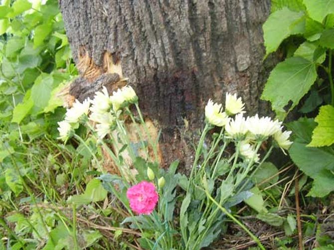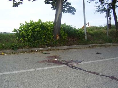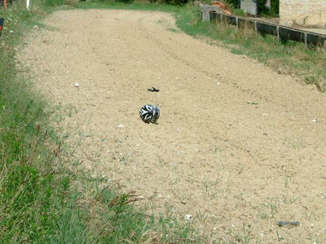 E qui, dopo il tremendo impatto, uno dei due, probabilmente il guidatore, sia finito anche lui contro l'albero sbattendo così violentemente la testa da rendere praticamente inutile la protezione del casco. Ne era anche testimione una copiosa macchia di sangue che qualche mano pietosa, a poco tempo dall'incidente, aveva provveduto a coprire con un mazzo di fiori freschi.