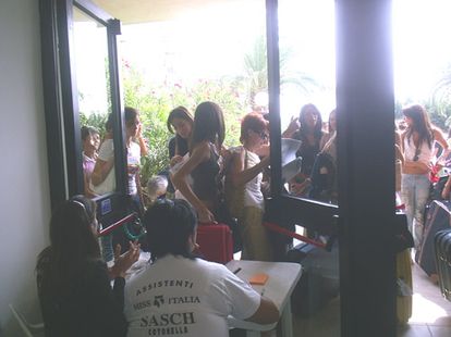 Telefonini alla mano, foto, sms, mms, vms le Miss del 2005 al passo con la tecnologia aspettano il loro turno per essere registrate e firmare il contratto di partecipazione al Concorso, per 101 di loro dopo San Benedetto laccesso alle finali.