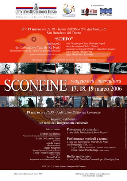 La Consulta Comunale per l’immigrazione di San Benedetto del Tronto, con il contributo dell’Amministrazione Comunale e in collaborazione con il Laboratorio Teatrale Re Nudo e la Fondazione Libero Bizzarri, organizza venerdì 17, sabato 18 e domenica 19 marzo, presso il Teatro dell’Olmo e l’Auditorium Comunale, “Sconfine - viaggio nell’intercultura”. L’iniziativa è articolata in tre giorni di dibattiti, performance teatrali e musicali, proiezioni video, degustazioni di cibi appartenenti a cucine di varie paesi del mondo.
