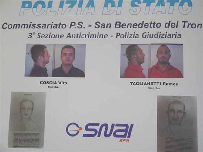 Avevano messo a segno una serie di rapine tra il 2001 ed il 2005 ai danni di diverse agenzie di scommesse ma sono finiti in manette arrestati dalla Polizia di San Benedetto del Tronto,  I due malviventi, accusati di rapina aggravata in concorso, sono stati sorpresi dagli Agenti ad Eboli; uno dei due è stato ammanettato mentre seguiva un comizio elettorale.
