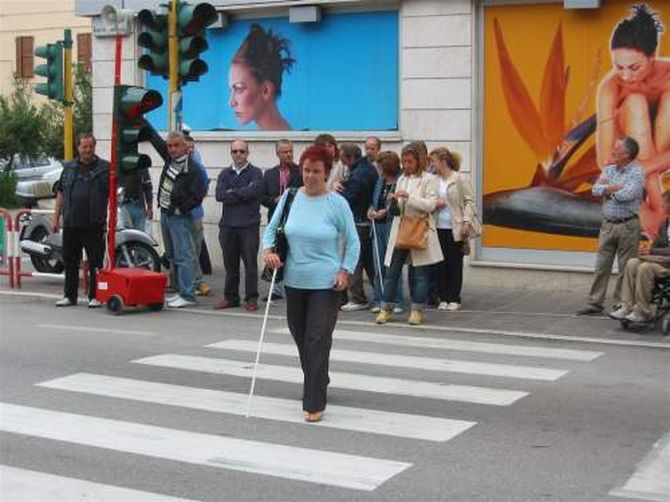 Si tratta di un sistema di avviso vocale (una voce invita il non vedente ad attraversare la strada) che viene attivato grazie ad un piccolo telecomando che è disposizione del disabile.
