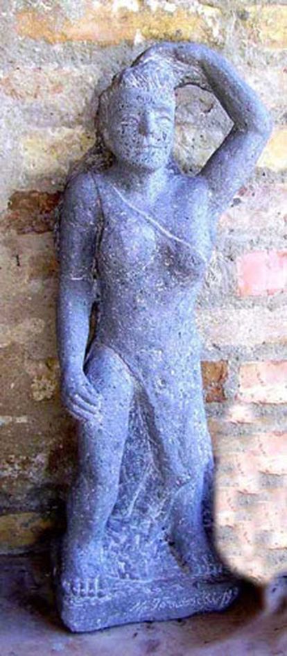 La seconda statua rubata su pietra grigia “Guarda” è una donna che vestita da una tunica sbracciata con un braccio arcuato sopra la testa, alta circa cinquanta centimetri e dal peso di una trentina di chili.