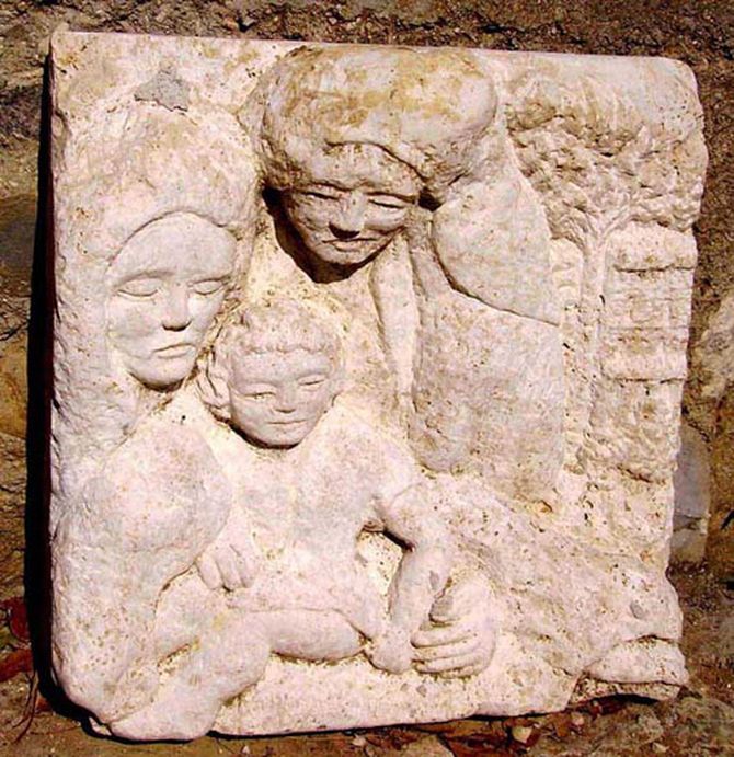 dalle dimensioni di circa sessanta cm per lato e una profondità dai dieci ai quindici centimetri. Rappresenta una sacra famiglia, opera firmata e datata 1998. Dato il peso e la difficoltà di presa, della “sacra famiglia”, quasi un quintale, si presume che i ladri siano stati in due o almeno sia stato persona di forza non comune.