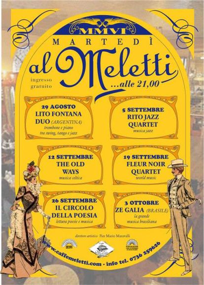 Attraverso la rassegna Martedì al Meletti si vuole dare spazio alle realtà locali, promuovere i giovani e aiutarli a crescere professionalmente offrendo come palcoscenico il meraviglioso Caffè Meletti con i suoi cento anni di storia e cultura e pertanto si invitamo tutti gli artisti Piceni e Marchigiani a proporsi.