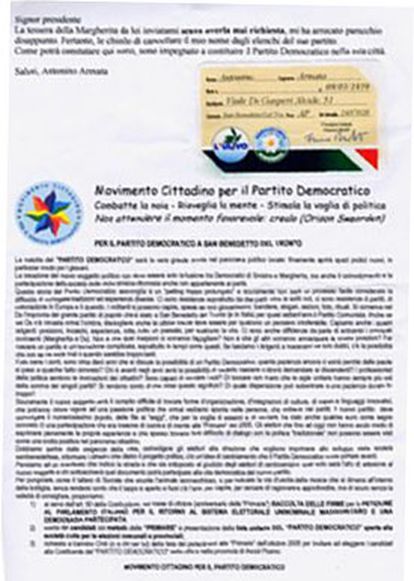 Pertanto invito quei cittadini, i quali hanno ricevuto la tessera fasulla dal partito DL – Margherita, di segnalarla a “il Quotidiano.it”, affinché, per la partecipazione al Partito Democratico, il prossimo congresso della Margherita si possa svolgere nel modo più corretto possibile.