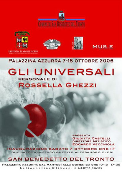“Gli universali” è il titolo della mostra di Rosella Ghezzi che aprirà Sabato 7 Ottobre alle ore 17 alla Palazzina Azzurra di San Benedetto del Tronto nel contesto di un piacevole incontro d’arte dove immagini, parole e musica tracceranno la via di un percorso didattico “creativo” .