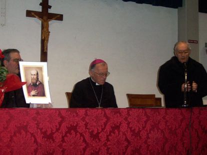 da sinistra: Don Romualdo Scarponi, leggermente coperto dall'immagine di San Francesco di Sales, Mons. Gervasio Gestori, Don Andrea Marozzi