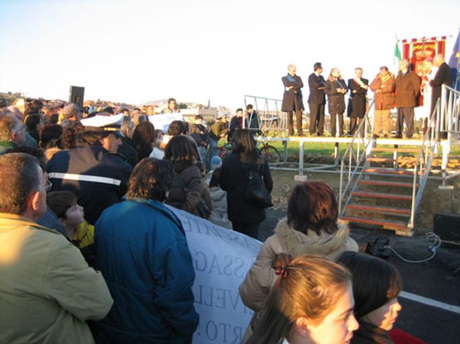 Il saluto di benvenuto è stato porto dal sindaco Schiavi che, nel ringraziare l’attuale e la precedente Amministrazione provinciale per essere riuscite a portare a termine un’opera così importante per i suoi concittadini, non ha voluto evitare la spinosa questione posta all’ordine del giorno dalla composta ma ferma protesta degli abitanti della zona di S. Mauro, un’area urbanizzata situata poco distante dalla nuova circonvallazione. Questi ultimi, infatti, presenti all’inaugurazione in massa e con cartelli di protesta, denunciano che, con la chiusura al traffico di un passaggio a livello contestuale all’apertura della nuova arteria, l’area non è più collegata alla Salaria e quindi con il resto dell’abitato di Stella, costringendo ad un lungo giro che richiede l’uso dell’auto. Il Sindaco ha assicurato che già da domani verrà aperto un confronto con tutte le istituzioni competenti (erano presenti anche i vertici regionali di RFI) per individuare il percorso più breve che porti alla realizzazione di un sottopasso “scatolare” ciclopedonale.