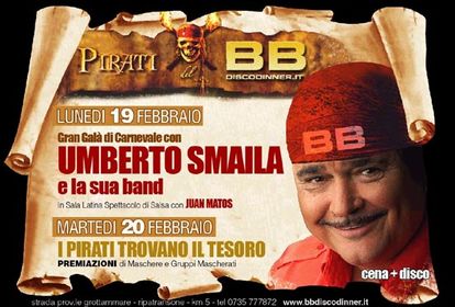 Ma per questa edizione del Carnevale al BB il vero appuntamento da sottolineare e' quello di lunedì 19 febbraio con ospite Umberto Smaila. Con la sua Band, allieterà gli intervenuti durante la cena con le sue hit. Show anche in Latin rom con uno spettacolo di salsa di JUAN MATOS. Serata quindi di Gran Gala' con le tre sale (Latin room,BB disco e B-JU' house privee), aperte, così come il martedì 20, per la chiusura del Carnevale con la consueta premiazione delle maschere e dei gruppi più belli ed originali.
