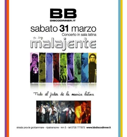 Piper - Nico Virgili, Tania e i fantastici ragazzi del centro di formazione allo spettacolo.Sabato 31 per la gioia degli innumerevoli fans della musica LatinoAmericana, ecco di scena, in concerto i los MALAJENTE, gia' di per se' gruppo numerosissimo e dalle crtiche avute di un coinvolgimento realmente unici ed impareggiabili. Ricordando che il sabato BB (Dentro lo show, lo slogan di quest'anno), consta di tre ambienti, con tre diverse sonorita' musicali, latino appunto, disco commerciale ed house al b-ju', accontenta diverse tipologie di giovani, coinvolgendole in un unico comun denominatore:Il Puro Divertimento.