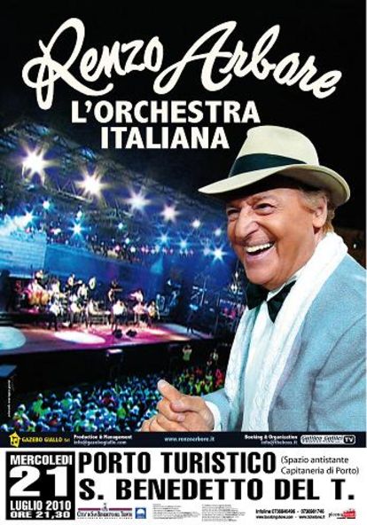 Renzo Arbore L'Orchestra Italiana continua il tour estivo 2010. L'artista sarà in concerto a San Benedetto del Tronto, mercoledì 21 luglio, ore 21.30, presso l'area del Porto Turistico. La serata‐evento, che apre ufficialmente i festeggiamenti per la