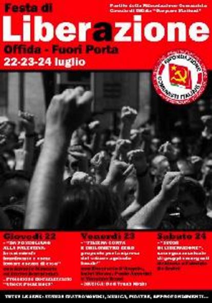 Prende il via giovedì 22 luglio la Festa di Liberazione organizzata dal Circolo "Gaspare Mattoni" di Offida di Rifondazione Comunista. Mostre, musica, stand enogastronomici e molto altro compongono un programma che si preannuncia molto interessante soprattutto per quanto riguarda gli approfondimenti politici.