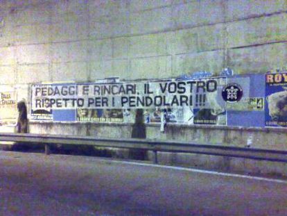Gli striscioni contenevano frasi quali " PEDAGGI E RINCARI, IL VOSTRO RISPETTO PER LAVORATORI E PENDOLARI ", " NO AL PEDAGGIO ", " CITTA' ISOLATA = CITTA' MORTA, NO AL PEDAGGIO ". ecc.