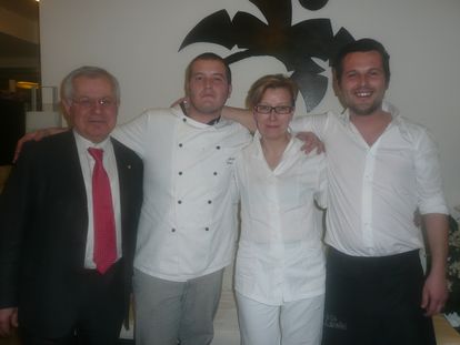 Delfina e Simone con il responsabile di sala Alfonso Stuardi e il fiduciario della Condotta Slow Food Raffaele Grilli
