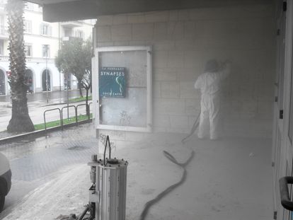 Il lavoro di pulizia da graffiti e imbrattamenti vari viene realizzato con un’apposita apparecchiatura in grado di rimuovere i segni lasciati dalla vernice su diversi tipi di superfici. Si tratta di un sistema di pulitura a doppia funzione (idrolavaggio con carbonati e altri minerali e eco-sabbiatura a secco) concepito per rispondere a tutte le esigenze di pulitura selettiva di vetrate, profili in alluminio anodizzato e marmi lucidi non porosi, strutture in acciaio inox o alluminio, ma anche paramenti lapidei, strutture ed elementi architettonici in pietra, marmo e laterizi particolarmente delicati.