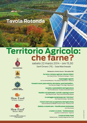 Alla tavola rotonda si parlerà a 360 gradi dei territori agricoli, dei diversi utilizzi, con la dottoressa Paola Di Felice, Direttrice del Museo Archeologico di Teramo, dei pannelli solari, pale eoliche, bio masse, con il dottor Giancarlo Pelagatti, Presidente Regionale "Italia Nostra"; il professor Dino Mastrocola, Pro Rettore dell'Università di Teramo, si soffermerà sulla qualità e sostenibilità dell'agricoltura, mentre il dottor Valentino Ferrari, Responsabile Centro Ricerche di Monsampolo del Tronto si soffermerà sul reddito che si può ottenere coltivando pomodori, carciofi, asparagi e porri.
