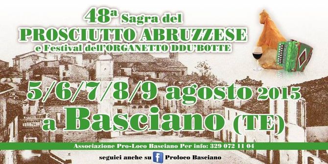 Dal 5 al 9 agosto, Basciano tornerà ad animarsi con la Sagra del Prosciutto Abruzzese e il Festival dell'organetto "Ddu' bbotte", e il paese, per l'occasione, si adorna a festa, per accogliere i numerosi estimatori di queste due belle manifestazioni, senz'altro tra le più longeve e consecutive, fin dalla nascita (1968) della Regione Abruzzo