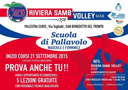 Inizieranno lunedì 21 settembre presso la palestra Curzi di Via Togliatti a San Benedetto del Tronto i corsi della stagione sportiva 2015/2016 del Riviera Samb Volley.