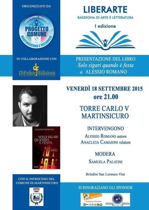 "Solo sigari quando è festa" è il primo appuntamento di "LiberArte", la rassegna di arte e letteratura, organizzata dall'associazione culturale Progetto Comune in collaborazione con la Di Felice Edizioni e con il patrocinio del Comune di Martinsicuro.