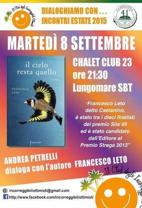 Martedì 8 settembre, presso il Club 23, alle 21:30, il giovane Francesco Leto, su invito del Il Club degli Incorregibili Ottimisti e della libreria La Bibliofila, presenterà il suo secondo romanzo, "Il cielo resta quello", edito da Frassinelli. Un grande romanzo corale ambientato nella Bagnara Calabra (il paese natale di Mia Martini, per intenderci) della metà del secolo scorso. Il secondo ospite della serata sarà il pittore Iuri Paolini, in arte Ferramenta, che attuerà con lo scrittore un originale esperimento. In attesa della serata, eccovi un'intervista propedeutica.